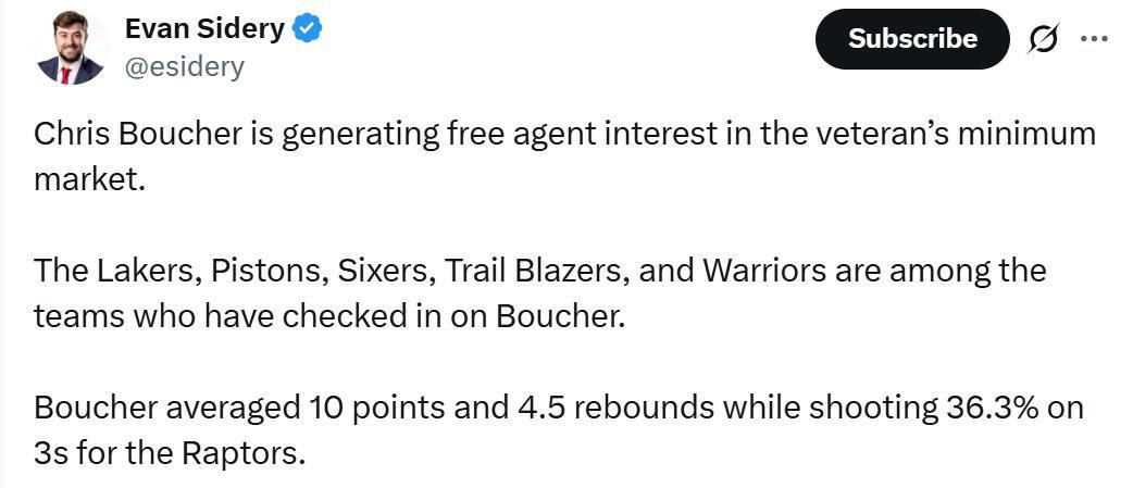 根据Evan SIdery报道,多支球队有意得到自由球员湖人、活塞、76人、开拓者和勇士布歇,其中就包括